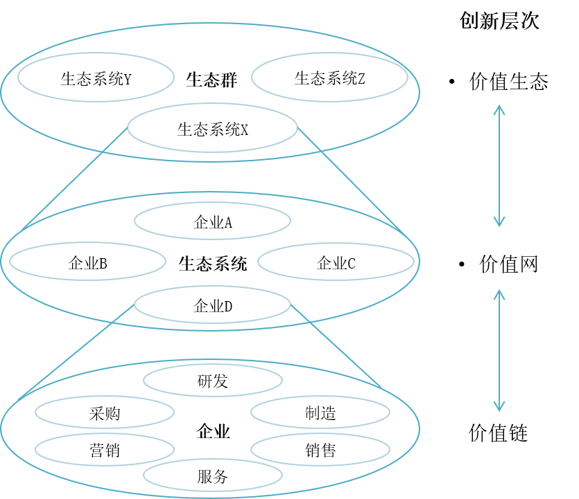 在基础的管理创新方面,管理大师彼得·德鲁克曾在《有效的主管》一书中曾指出:“效率是‘以正确的方式做事’,而效能则是‘做正确的事’。”管理是由计划、组织、领导、控制等职能为要素组成的活动过程。管理决定执行效率;在战略创新方面,尽管战略学说形形色色,但是归根结底核心要素依然是三个:企业、顾客、竞争对手。这三个要素被大前研一称为“3C”框架。所有企业都要制定自己的战略,战略直接影响竞争效率;在价值网和价值生态创新方面,与管理决定执行效率、战略直接影响竞争效率不同,在整个维度上决定的是企业所在商业生态系统的结构效率。结构效率大于执行效率和竞争效率。