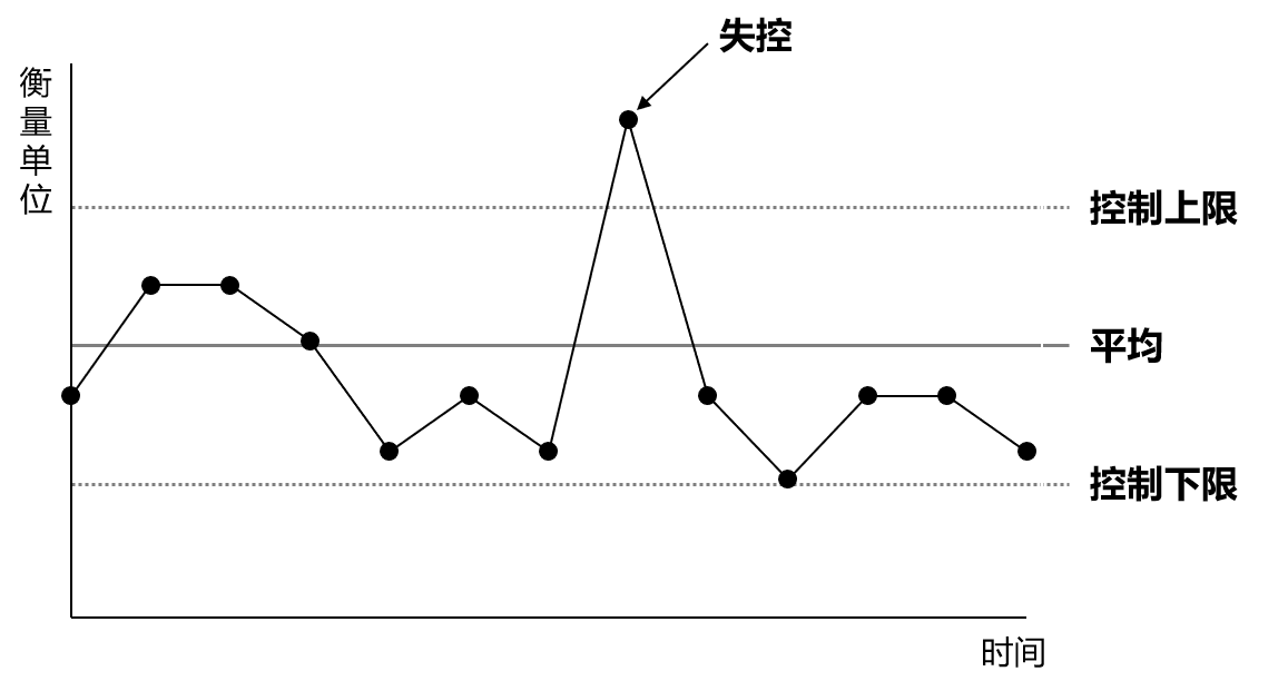 战略目标及战略分解后的年度计划和预算指标,一般是一条平滑的直接或曲线,而在战略执行的实际结果是围绕着这一条平滑的直线或曲线上下波动。按照平衡偏差原理对实际结果进行有效控制,以确定战略目标的实现。通过控制图分析,可以找到哪些变动是在合理的范围内,哪些变化必须引起高度警戒,采取措施甚至进行调整。如图7-8所示。