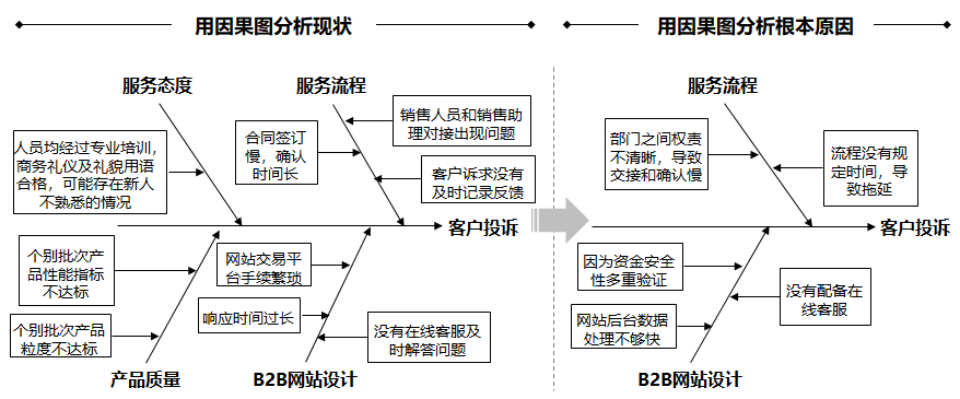 制作因果图分为两个步骤:分析问题原因/结构、绘制鱼骨图。
