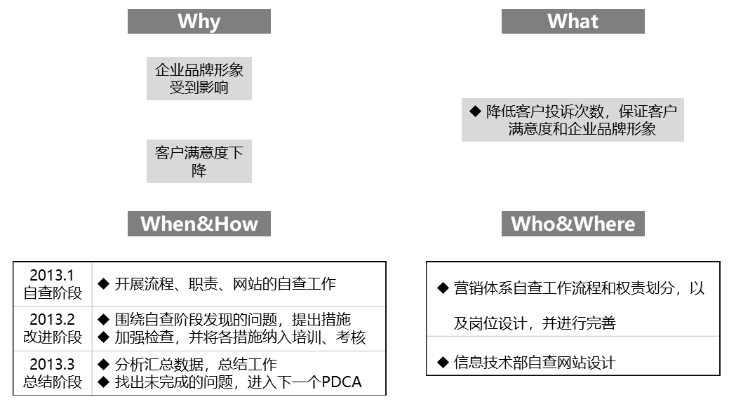 以PDCA分析法为例,某矿业企业根据战略目标,选取了以下几个重点指标进行现状和目标对比,如表7-4、图7-10所示。 表7-4 某矿业企业现状和目标对比 图7-10 某矿业企业差值比 第一步:在战略目标中,该矿业企业客户投诉次数年度的战略目标值偏离度较大,客户投诉次数是衡量在营销过程中,客户服务质量的关键指标。 第二步:用因果图分析原因及根本原因确认,如图7-11所示。 图7-11 因果图 第三步:拟定措施、制定计划,如图7-12所示。 图7-12 拟定措施、制定计划 第四步:执行措施、执行计划,如表7-5所示。 表7-5 执行措施、执行计划 第五步:检查验证、评估效果。 达成结果:客户投诉次数降为1。 第六步:标准化,固化成绩,并处理遗留问题,如表7-6所示。 表7-6 标准化,固化成绩 以雷达图分析法为例,某企业从收益性、安全性、流动性、成长性、生产性五个维度选取了15个指标,企业本年度的战略目标值和实际完成值如表7-7所示。 表7-7 企业本年度的战略目标值和实际完成值 第一步:算出对比值比例,方便作图,用企业实际值/企业战略目标值,得出对比值。 第二步:画出三个同心圆作为坐标系,最小圆代表战略目标的1/2,或最低水平;中间圆代表战略目标(即标准线),最大圆代表战略目标的1.5倍。 第三步:在每个指标区域内,从圆心画出射线,作为指标线,并标出名称及标度(标度由该经营比率的量纲与战略目标决定)。 第四步:将每个指标的对比值,以点标在图上,以线段依次连接相邻点,形成的多边形折线闭环。 第五步:依据雷达图,对企业展开分析。可以看出,企业的收益性接近战略目标。安全性中,利息保障倍数与战略目标偏离度较大;流动性均接近战略目标;成长性中,净利润增长率与战略目标偏离度较大;生产性中,人均资产总额、人均销售收入与战略目标偏离度较大。整体来看,企业的成长性和生产性最需加强。如图7-13所示。 图7-13 某企业雷达图 通过会议研讨和工作回顾,根据行业发展状况和公司现状,该企业提出了减员增效、加强销售渠道建设两项大的战略调整举措,以期在未来达到战略目标。 |