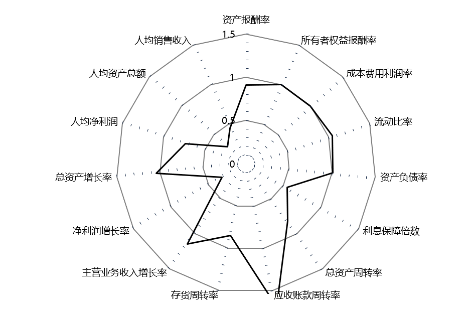 雷达图分析法是将企业的各项评价指标比率,集中画在一个圆形图上,进而对企业财务状态和经营现状进行直观的综合分析与评价的图形。因其形状如雷达的放射波,且具有指引经营“航向”的作用,故而得名。企业通常选取成长性、生产性、流动性、安全性、收益性五个方面,对企业财务状态和经营现状进行直观、形象的综合分析与评价。企业也可以根据自己战略目标设置的具体情况进行指标的调整。