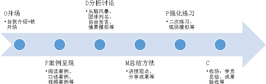 在这里介绍一个比较容易操作的流程,为方便记住这个案例教学过程,我们将案例教学流程的关键动作名称用英文的第一个字母进行代替——OPDMPC,即Open(开场)、Present(案例呈现)、Discuss(分析讨论)、Method(总结方法)、Practice(强化练习)、Close(收场)。案例教学天然重塑了教学体验,过程完全是以学员为中心,以结果为导向,以脑友好型为宗旨的教学理念。如图8-1所示。