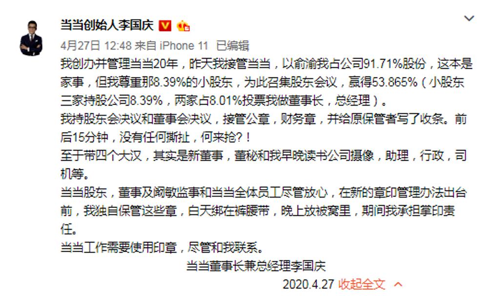 ⑧2020年4月7日,李国庆以当当网股东会决议形式,自称为董事长兼总经理,如图3-2所示。