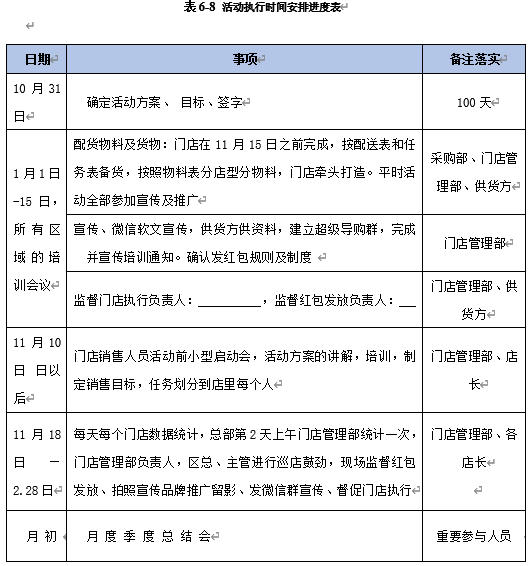 1.活动执行,行动队到每个门店进行拜访,活动POP宣传,门店进行活动创意POP手绘(确保每个门店有2张以上); DM折页放置,顾客随手可以拿得到;以下物料落实到位情况,每个门店有实际货物陈列,并且空盒不低于10个(见表6-9), 空盒由店长陈列到位,在超级导购训练营开班前,凡是将陈列图片发给供货方地通过的,每位店长发3小盒某中成药。片区经理或者运营部监督到位95%以上者奖励原品一提或者6小盒。奖励在培训时统一发放。