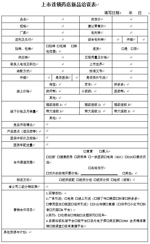 一般来说,连锁药店新品进场会让您填写《新品洽谈表》这张表,很多服务中小连锁药店的供应商根本不可能想到这样详细,供应商顶层规划时一定要按此思考和规划。
