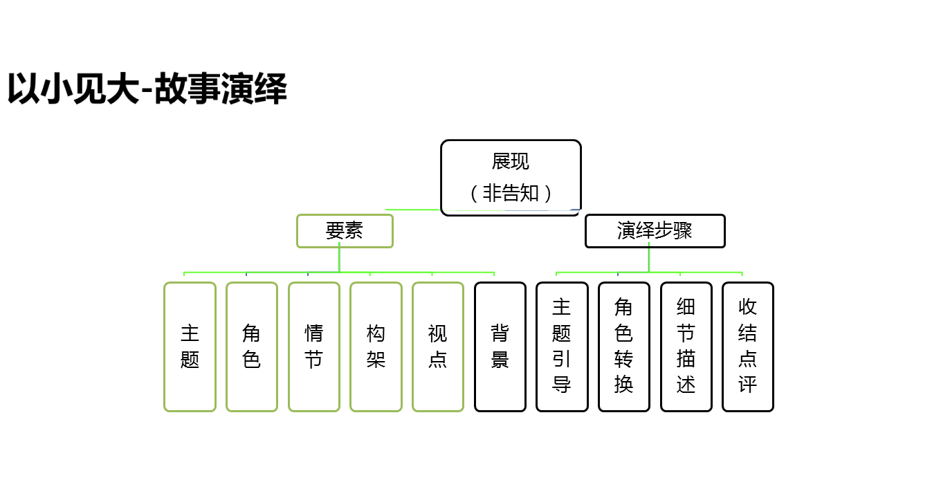 总之,演绎好一个故事,特别需要注意展现而非告知。并且切实做好以下四个环节分别为:主题引导、角色转换、细节描述和收结点评。诚如是,方为“故事演绎”培训方法之要旨,详细内容如图3-1所示。