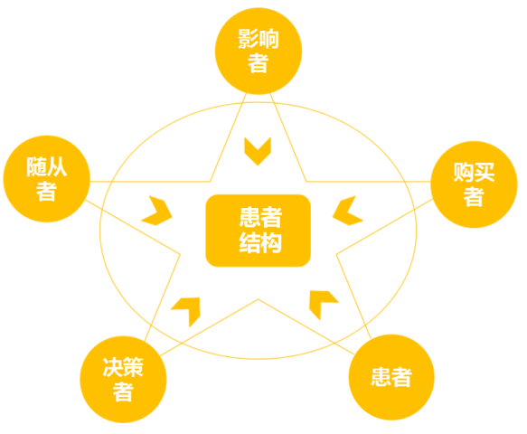 第四个角色是影响者。影响者是指其本身无法直接为患者做决策,但他会对决策有影响。比如陪同者有过治疗经验,对方案有一定的了解,患者在考虑方案时会大概率选择倾听陪同者的意见,希望能从专业角度给出建议和分析。