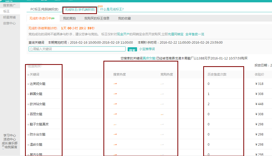 细心的同学会发现,这里还有个无线标王及PC标王。是的,我们的建议是:如果可以,请选择PC和无线标王里都有的词,为什么?因为手机和PC端都有人搜索。
