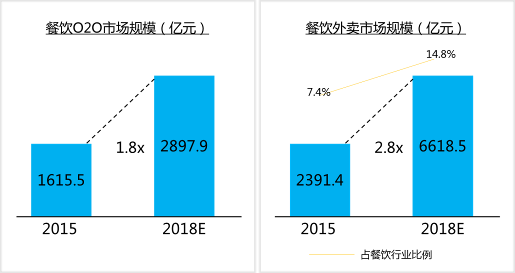 餐饮O2O和外卖市场规模在即将发生的几年时间,将呈现爆发式增长。尽管酒水饮料在餐饮O2O和外卖市场规模里占比非常小,但是随着餐饮O2O和外卖市场的快速增长期待有一个很大的增长。