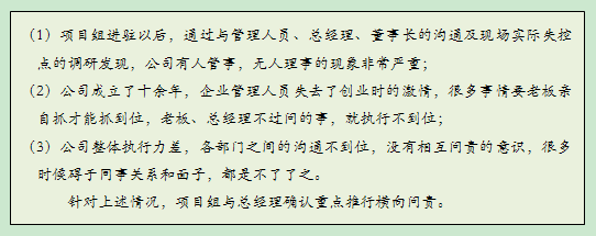 :项目组进驻以后,通过与管理人员、总经理、董事长的沟通及现场实际失控点的调研发现,公司有人管事,无人理事的现象非常严重。