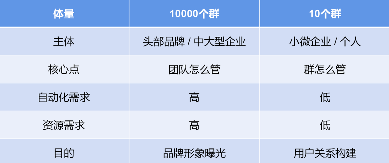 社群矩阵营销必然会带来一个最明显的结果,即社群数量的差异。当社群数量较少时,一般往往是个人或者初创公司,这时候可以专注社群的各种精细化运营。而当社群矩阵规模不断扩大,其背后维护的主体也将会出现规模差异。大部分情况下,规模大的背后往往是相对较为成熟的企业、品牌主、头部社区团购公司、头部在线教育公司、品牌连锁等。这类企业的社群规模往往可以达到数万,甚至数十万的量级。