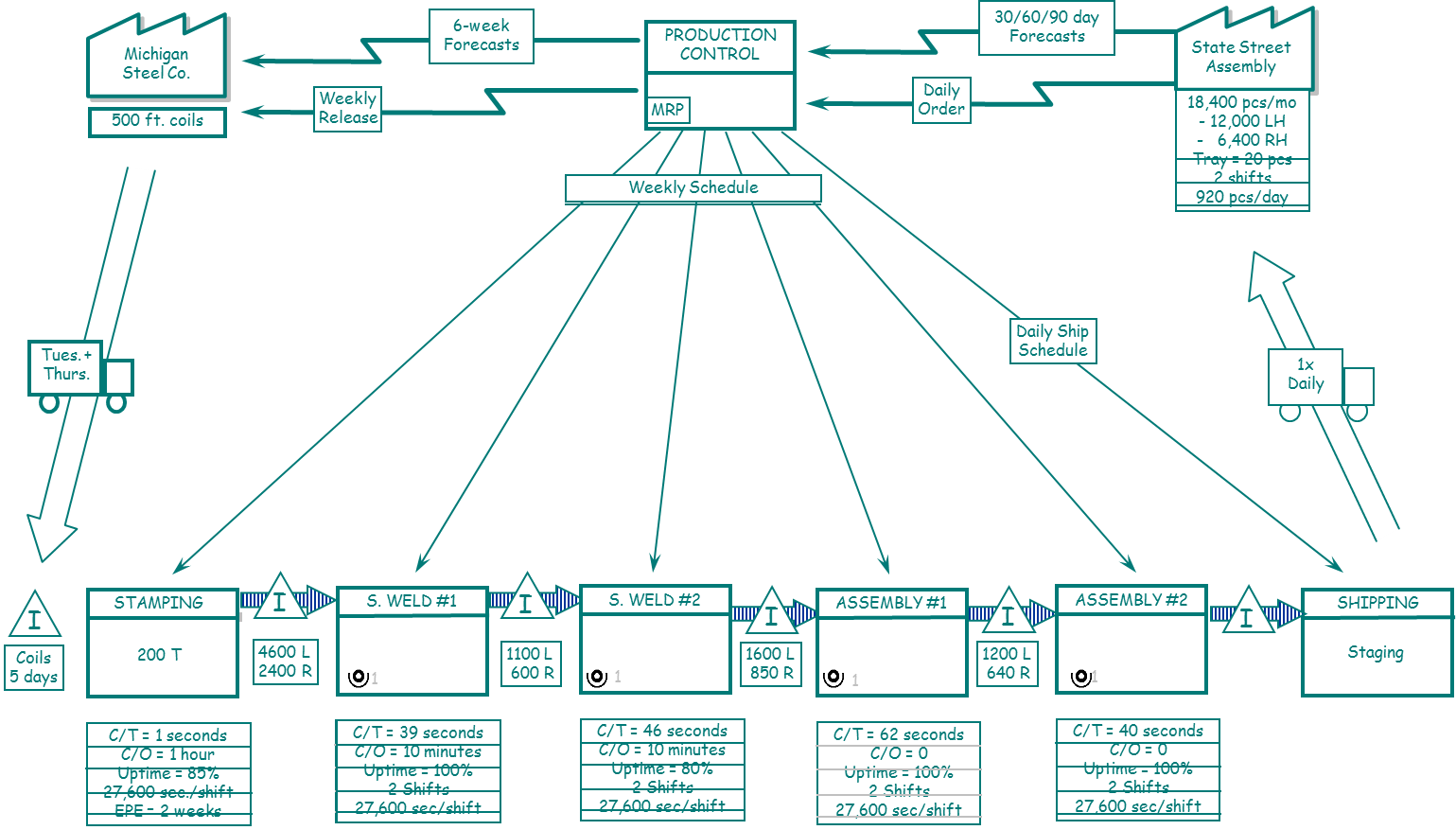 材料流的绘制在图的下半部分由左向右进行。在该工厂,转向盘支架需要进行六个过程:冲压、点焊1工位、点焊2工位、装配1工位、装配2工位、发运。