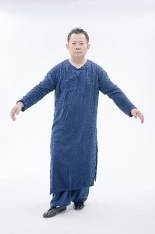 2.左脚底踩下送腰胯向左旋,带动右肩及右手掌向前送出,左手掌后迎,如暗含白蛇吐信式,为一细微小动作。左脚底再踩下,带动腰胯向左旋,同时双手松掉落于左胯旁,手心相对。