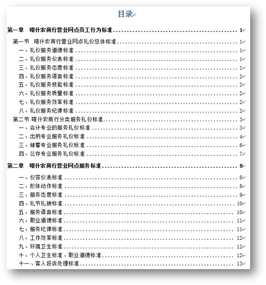 接下来还是给大家介绍一个实战的案例。笔者给喀什某银行做的《营业网点标准化管理手册》,仅目录就包含5章(如图1-5、图1-6所示),每章还有很多小节,最后花了大概三天的时间就完成了。