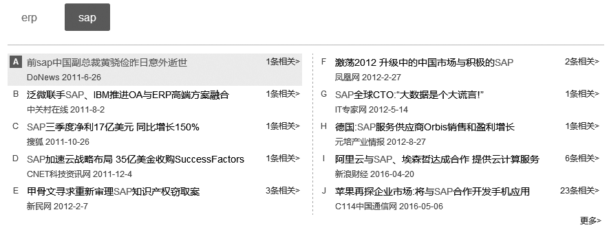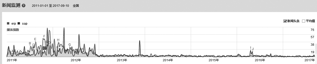 通过这些当时的热度新闻也能看出ERP行业哪些新闻媒体更重要,同样你也可以找到自己行业的重要新闻媒体。大家会注意到,自2013年起,ERP行业的媒体指数一直很低迷,除了2013年SAP同略会前后有一个新闻热点,再就是2016年I点和J点新闻引起的小热点,其他时间点很少引起新闻媒体关注。一方面,说明SAP公司在新闻宣传方面的投入减少;另一方面,说明ERP行业日渐成熟,发生事件很少引起媒体热炒。