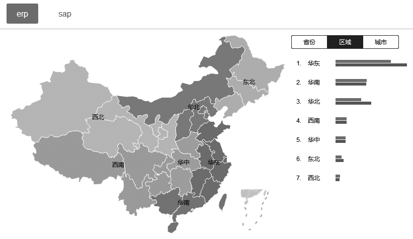 图7-9与图7-8明显的区别在于,按大区统计时,华东地区比华南地区用户数高出一倍,而且华东和华北地区的SAP关注度高于ERP。在做广告预算时,需要加大这两个大区的投入,特别是与SAP相关词的投入。