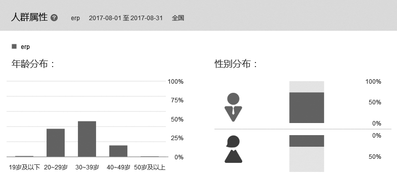 对于年龄和性别的画比较粗放,可作为某些精准营销的参考。如图7-11所示,ERP行业关注度最高的是30~39岁的人,其次是20~29岁的人和40~49岁的人,关注该行业的男女比例是73:27。