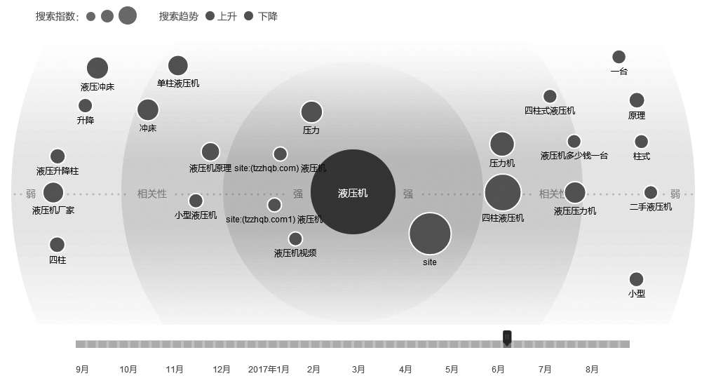 我对比了一下6月20日以来的【需求图谱】,也有异常。这一期间,与液压机相关度比较高的竟然是百度的site命令及两家网站相关的搜索词,这完全有可能是两家企业自己狂点而干扰了数据,如图7-13所示。