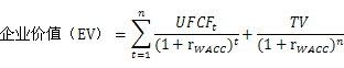 式中,EV为企业价值,TV为预测期末的终值,n为确定的预测期,为确定预测期内第t年无杠杆自由现金流量,g为永续增长率,