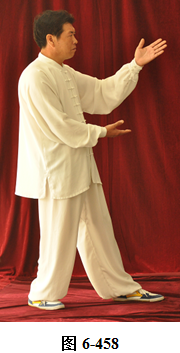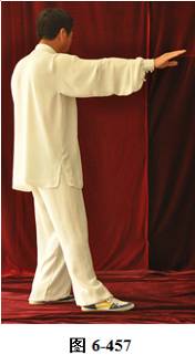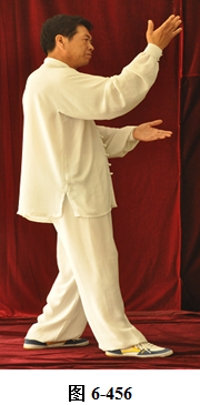 左撵:含腰左转,身体随之左转,左脚抬起随腰左转,平行后撤一步,重心移至左腿,左脚踏实,脚尖稍朝东北。右脚尖随即移向正东;随转体左掌弧形后撤回收左胯旁,右掌弧形向上向前推出, 眼神随转体向前平视转移,并观之前推之掌(见图6-456至6-457)。