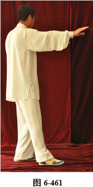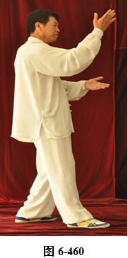 左撵:身体左转,腰微拱下沉随即上提,向左旋转,身体随之左转。同时,右掌向后偏右弧形抬至略高于肩,左臂外旋,使掌心朝上,眼神观注右掌后抬;左脚后撤一步,重心渐落于左腿。左脚踏实,脚尖稍朝向东北。右脚尖随即移向正东;随转体,左掌弧形后撤回收左胯旁。右掌弧形向上向前推出,眼神随转体向前平视, 并观之前推手掌(见图6-460至6-461)。