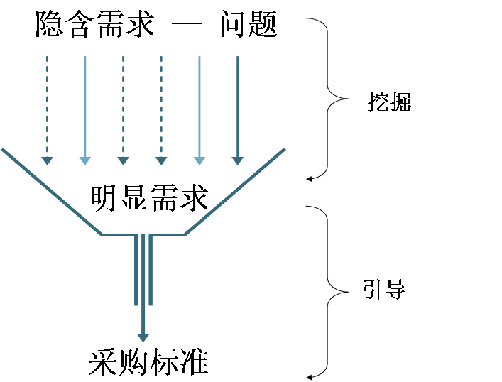 我们将需求漏斗中的隐含需求、明显需求、采购标准三个概念做如下总结: