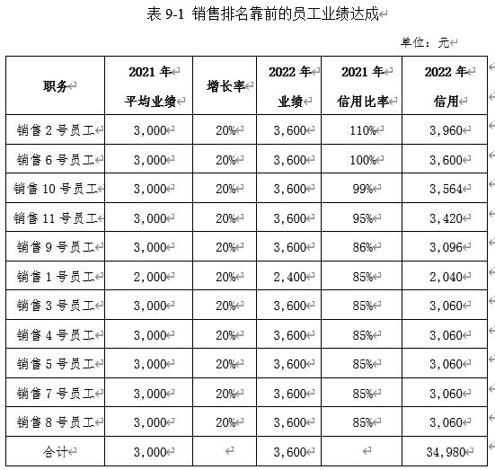 通过分析2021年销售排名靠前的员工业绩(如表9-1所示),我们可以发现销售2号员工在信用比率方面表现出色,达到了110%。这意味着该员工不仅完成了承诺的业绩,还超额完成了任务。