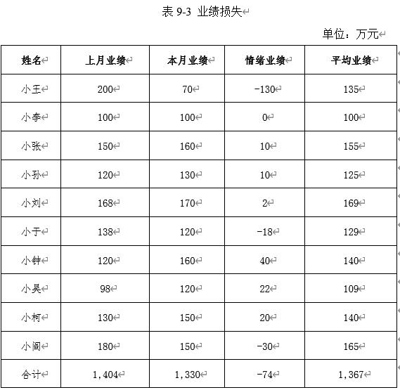 举例:A企业对销售部门员工进行业绩考核,销售部门共有10名员工,每名员工月度业绩考核为100万元。作为销冠的小王,这个月的业绩突然从200万元下滑至30万元。分析原因得知,小王的父母最近身体不好,小王平时看重业绩,无暇顾及父母的身体,这次父母病重,让小王深感内疚,所以业绩下降了170万元。小王因自己情绪的变化而导致企业的本月收入降低170万元。根据表9-3,累计74万元的业绩损失最终由管理者承担。