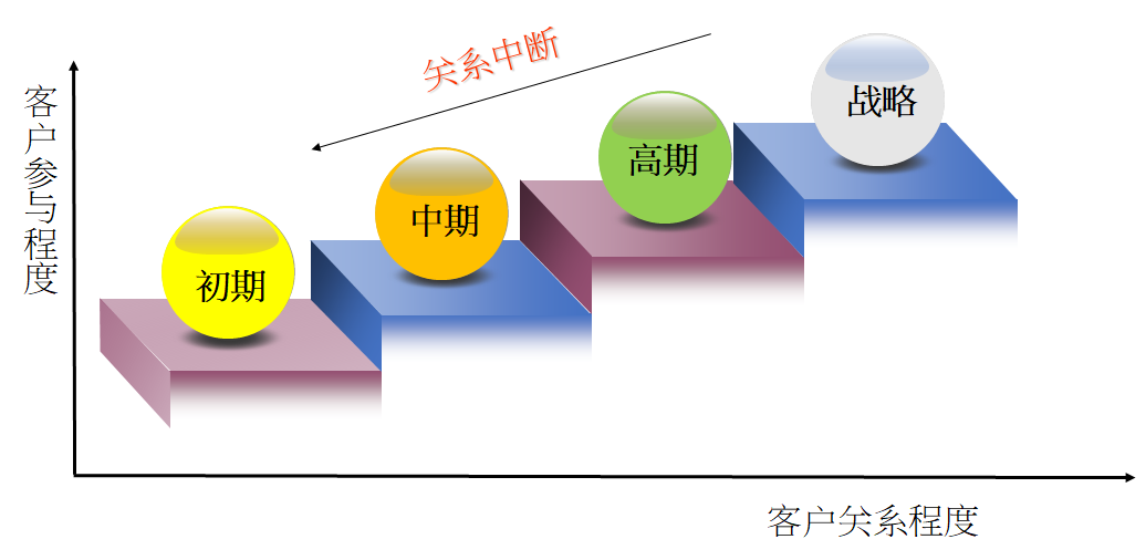 中期合作阶段 (合作关系) | 客户经理开始接触多个部门并获得生产、质检等部门的认可 只是客户几个供应商之一,客户仍会选择与其他供应商合作 价格和付款仍是客户主要考虑因素 |