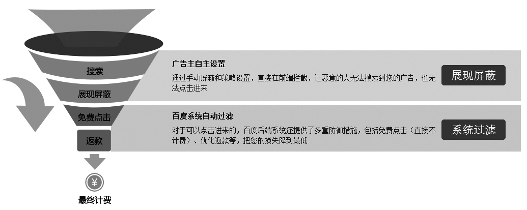 【展现屏蔽】:通过手动屏蔽和策略设置,将一些无效的点击排除在外。被屏蔽的IP或者访客将无法搜索到你的广告,也就无法通过百度搜索推广点击进入你的网页。