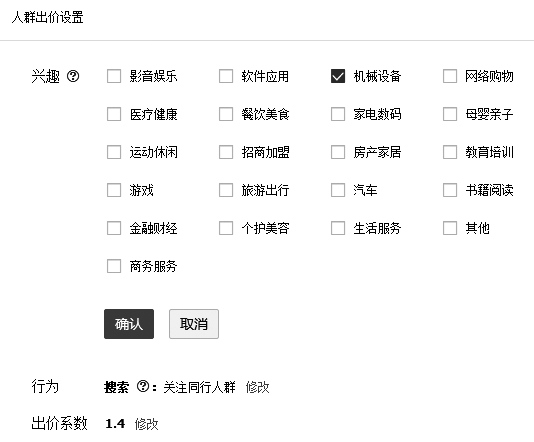 【人群】:百度可以在计划层级上对不同的人群投放不同价位的广告。尽管前面也提到过目前百度的人群划分比较粗放,而且多以电商角度对人分类。但对有可能是恶意点击人群的广告出价比较低,对潜在客户群出价比较高,既能引进更多的优质客户,也能过滤掉恶意点击者。如图3-68所示,我的一个客户做金属板材加工设备,他的推广账户在【人群】设置里,只选中机械设备并关注同行人群并给出了1.4倍的系数,可以拦截很多恶意点击。