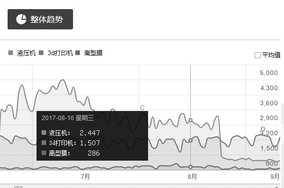 另外,需要指出的是不要谈虎色变,我在和许多企业主交流网络营销话题时,问及他们为什么不做百度广告。他们说怕恶意点击。其实,恶意点击现象主要发生在需求量大、竞争激烈的行业,只要你专注自己的细分市场领域,就会大大降低恶意点击的可能性。我选了三个行业的关键词做对比:一是传统机械加工设备:“液压机”;二是3d打印行业:“3d打印机”;三是离型材料行业:“离型膜”。图3-70是这三个词的百度指数。