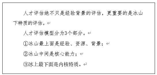通过这个案例你有没有一些新的发现?我们传统的猎头和招聘 者往往特别看中的是候选人的经验和背景,看中是什么学校毕业的, 是哪些大厂出来的,这的确是非常重要的参考依据,但是通过这个 案例我想分享的是, 一个真正适合的候选人除了冰山上面的经验背 景等外显的部分之外,还有冰山下内隐的部分,而且往往冰山下的 那些特质才是真正匹配的核心关键。 一个背景再好的候选人如果不 能生存下来,一切皆为空谈。