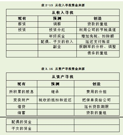 至于资金的来源则可考虑从收入和资产中寻找,如表2-15和表2-16所示: