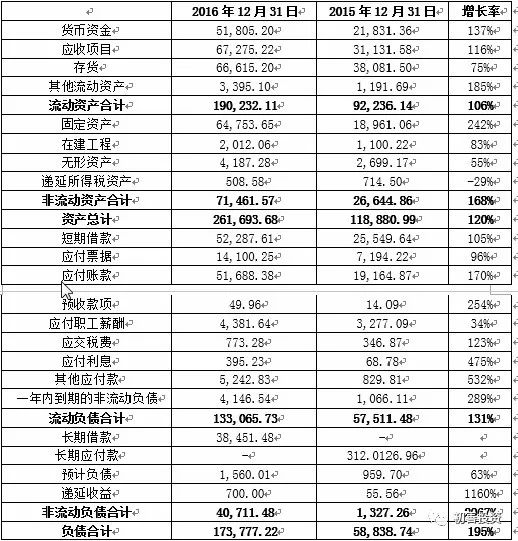 根据苏州旭创2016年的财报,净利润增长率达到106.53%。流动资产(货币资金、应收项目、存货等)、非流动资产(固定资产、在建工程、无形资产、递延所得税资产等)、负债等的增长率与利润增长率基本匹配。公司高度增长,扩产产能,固定资产增长242%,超出其他资产。预收账款提升254%,一方面说明公司的订单丰富;另一方面也说明公司在市场内具有较强话语权。非流动负债增长2967%,主要是由于会计期内新增长期借款的原因,同时也造成了应付利息增长475%,逻辑上通顺。如表6-27所示。