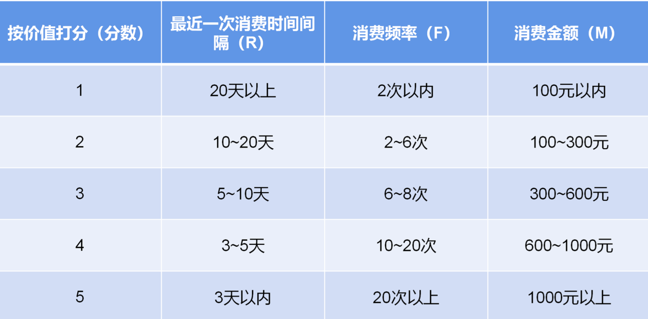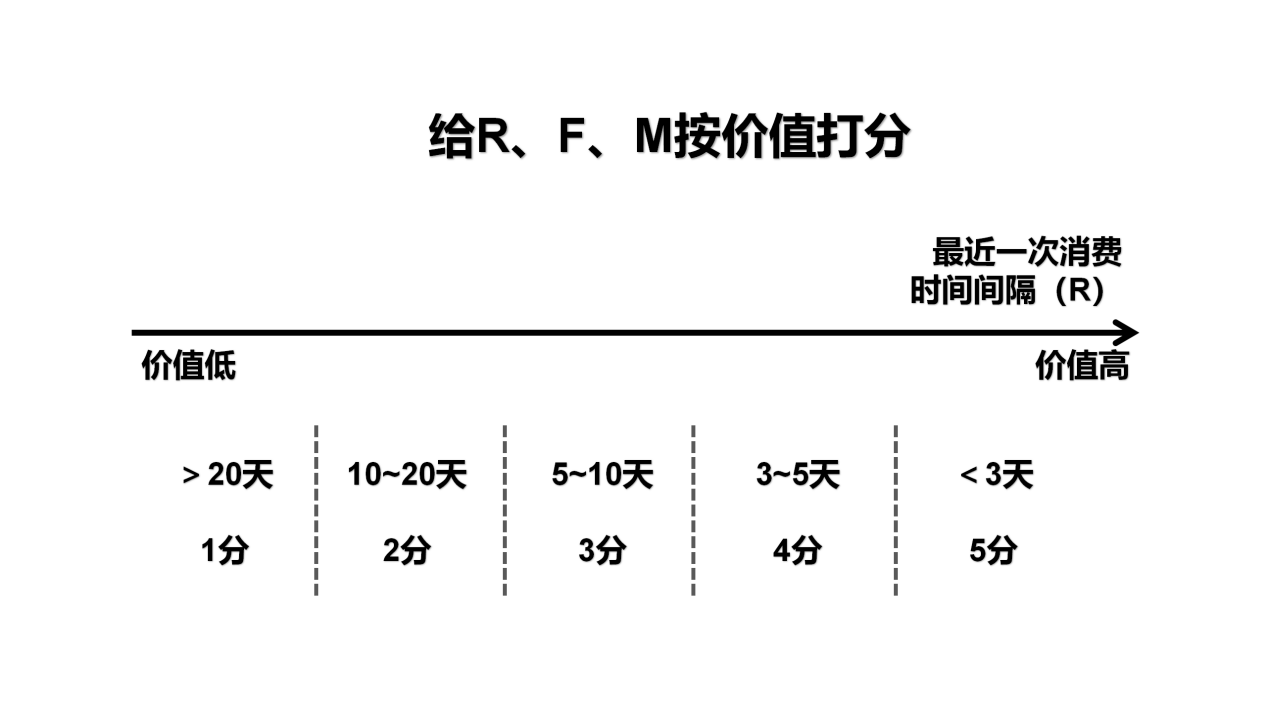 需要注意的是,这里的按价值打分,并不是按指标数值的大小打分。而是以R、F、M这三个数据的价值来进行打分。例如R指打分,根据最近1次消费时间间隔(R)来定,上一次消费离得越近,也就是R的价值越小,用户价值越高。如图3-13所示。