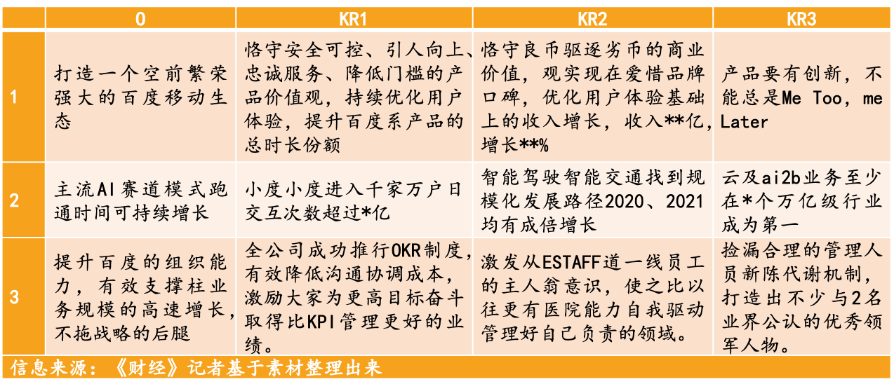 百度内部开始对最高决策层到最基层近5万名在职员工进行绩效改革,以李彦宏为例:每隔3个月会更新一次OKR: