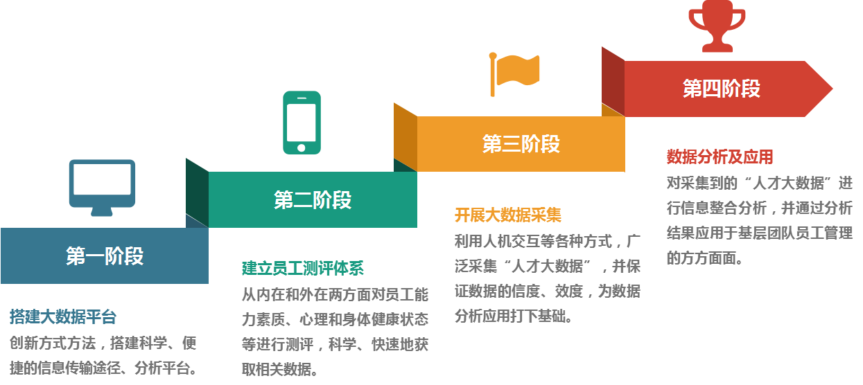 本研究共分为4个阶段,建立从数据采集、智能处理到分析应用的研究路径,并建立相应工具,支撑管理模式的运行。一是搭建大数据平台。围绕与员工工作、成长息息相关的方方面面,创新方式方法,搭建科学、便捷的信息传输途径、分析平台。二是建立员工测评体系。从内在和外在两方面对员工能力素质、心理和身体健康状态等进行测评,科学、快速地获取相关数据。三是开展大数据采集。利用人机交互等各种方式,广泛采集“人才大数据”,并保证数据的信度、效度,为数据分析应用打下基础。四是数据分析及应用。依托智能化数据处理,对采集到的“人才大数据”进行信息整合分析,并通过分析结果应用于基层团队员工管理的诸多方面。