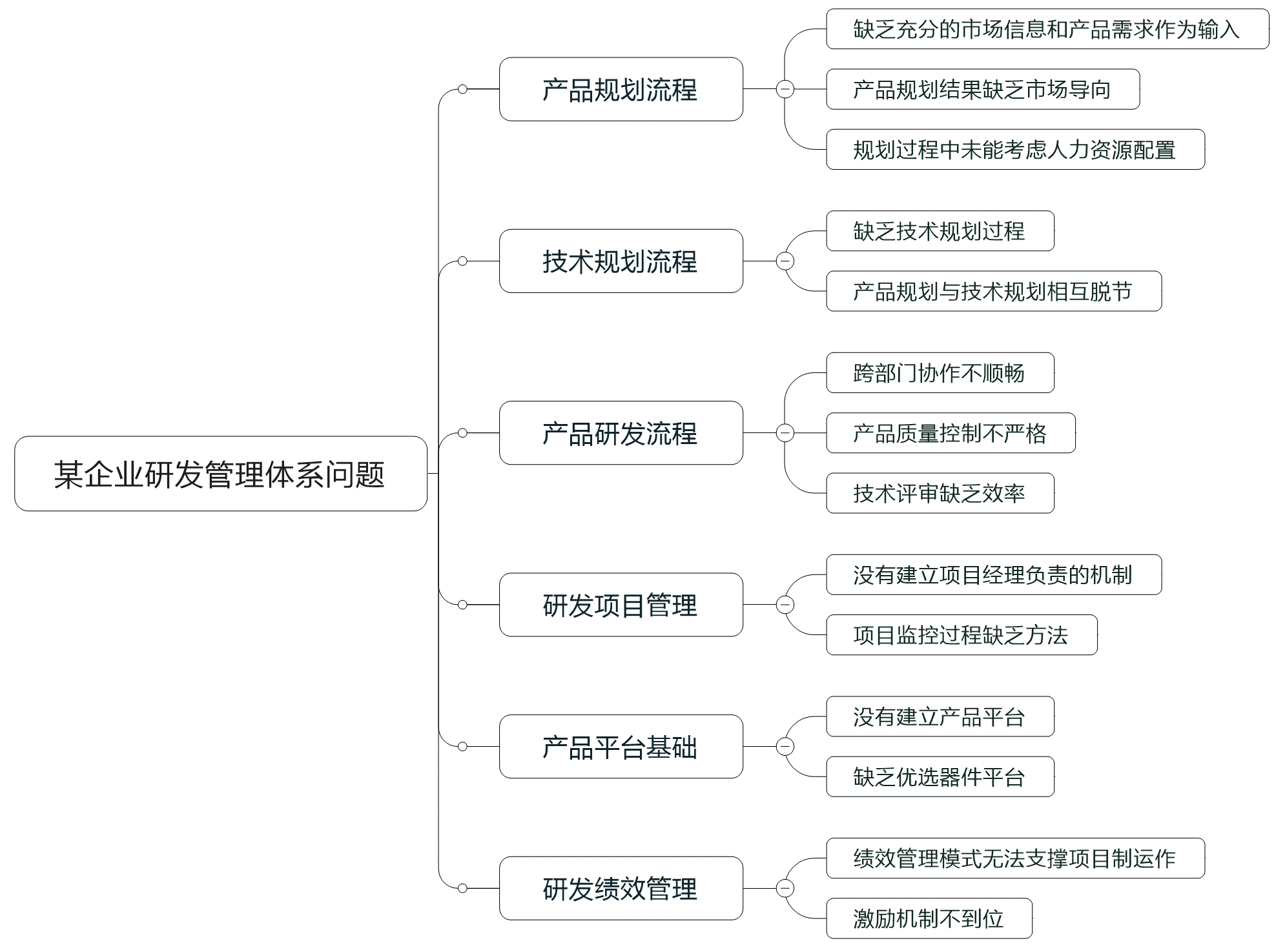 该企业在行业中处于领先地位,产品方向、团队技能和技术储备方面的问题并不突出,此处重点关注研发管理体系:将管理体系进行细分,而后列出了主要问题。图3-10展示了对该企业研发问题的全局分析,限于篇幅,省略了问题细节。