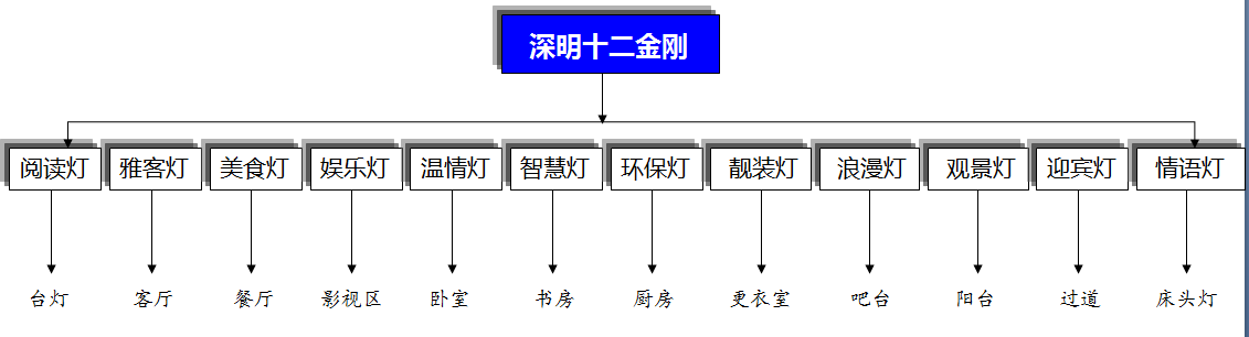 如图16-1所示,“深明十二金刚”是我们根据一个家庭常用的一些需要照明的区域对灯具进行的特殊命名,但这不仅仅是命名,深明光电需要配合双剑进行技术改造,将不同区域的不同使用需求的灯光进行特殊设计。例如影视区域的照明就需要暗淡一点,而餐厅区域的照明又需要聚焦餐桌中央菜肴,这就需要我们的技术人员分别对待,进行个性化改造,从而真正突出深明智谱光健康照明的科学性,也便于在行业内脱颖而出!