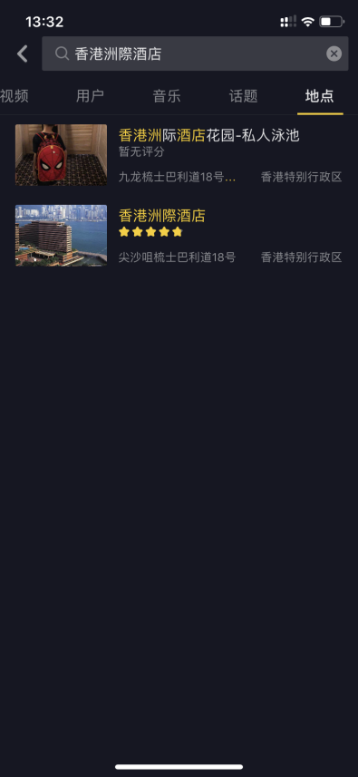 在抖音的搜索入口,有一个“地点”栏。在搜索栏输入实体店名字,点击会直接跳转到实体店的信息页。点击信息页上面的箭头,也会出现POI地址。如图4-23、图4-24和图4-25所示