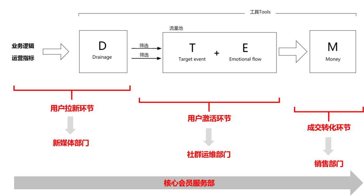 销售部门主要负责社群持续成交转化,促使更多社群用户转变为核心会员,同时做好售前、售后等服务。