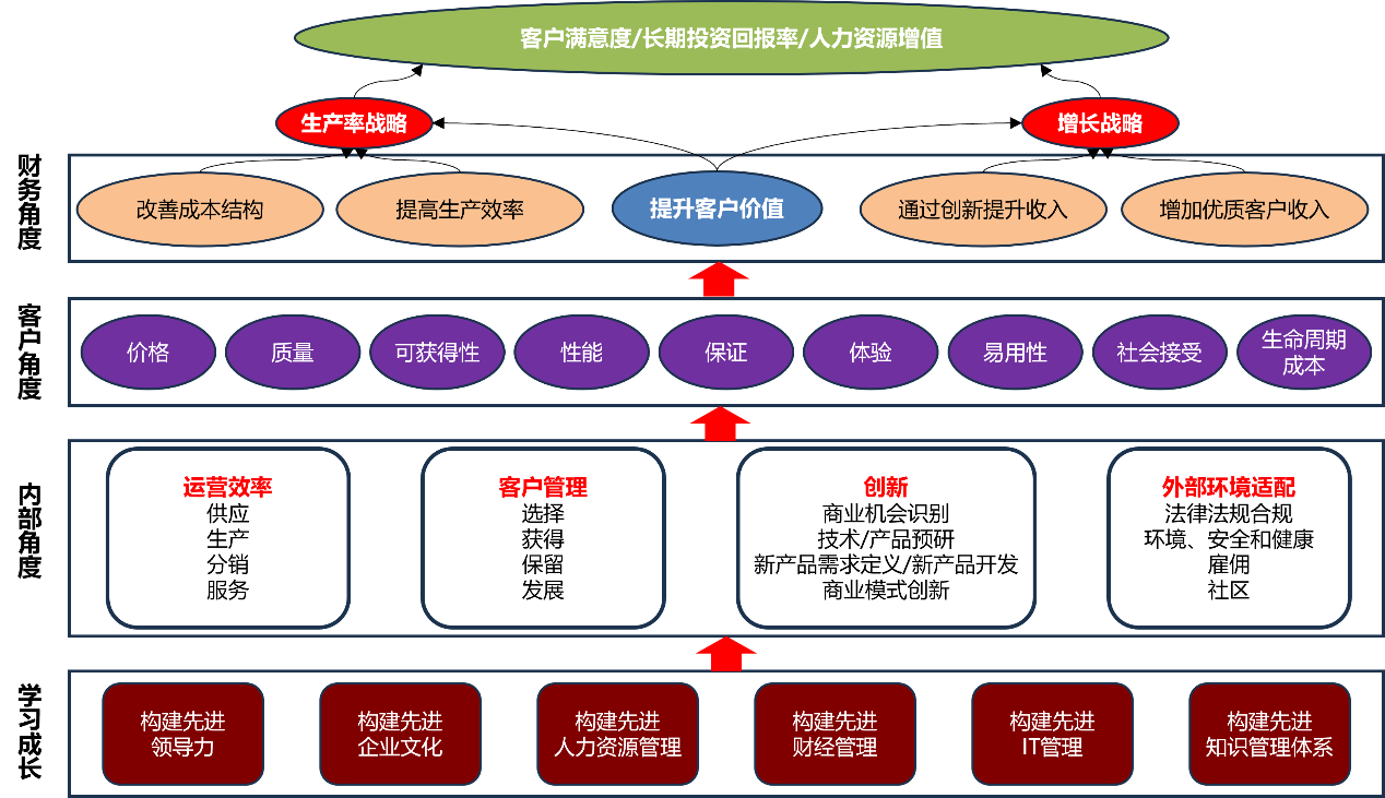 (1)学习成长维度。2027年实现50亿元营业收入目标需要全新的组织能力支撑,包括:构建先进领导力、构建先进企业文化,以及构建先进人力资源、财经、流程IT、知识管理的能力,这是需要识别出公司潜能,它是目标实现的组织保障。