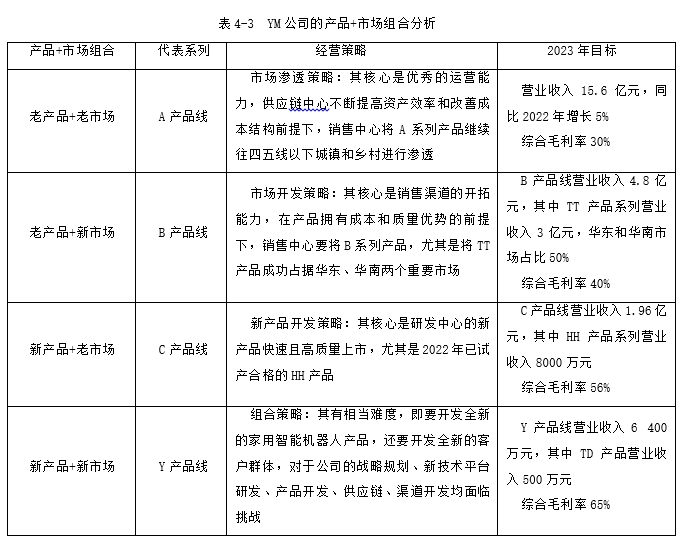 生产率战略的实现是成熟产品能够为企业提供更多的现金流和市场占有率。增长战略的实现,需要企业识别更好的商业机会并通过创新机制将机会变成现金。为了进一步将战略语言翻译为执行语言,让全体员工对战略目标可视化,YM公司的战略解码团队使用安索夫矩阵进行了产品+市场组合分析,见表4-3。