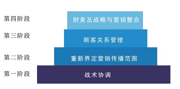 整合传播的创始人唐·E·舒尔茨总结了组织在进行整合营销传播时必经的4 个阶段(如图6-4所示)。舒尔茨认为不存在互不相干的、有严格边界的阶段。