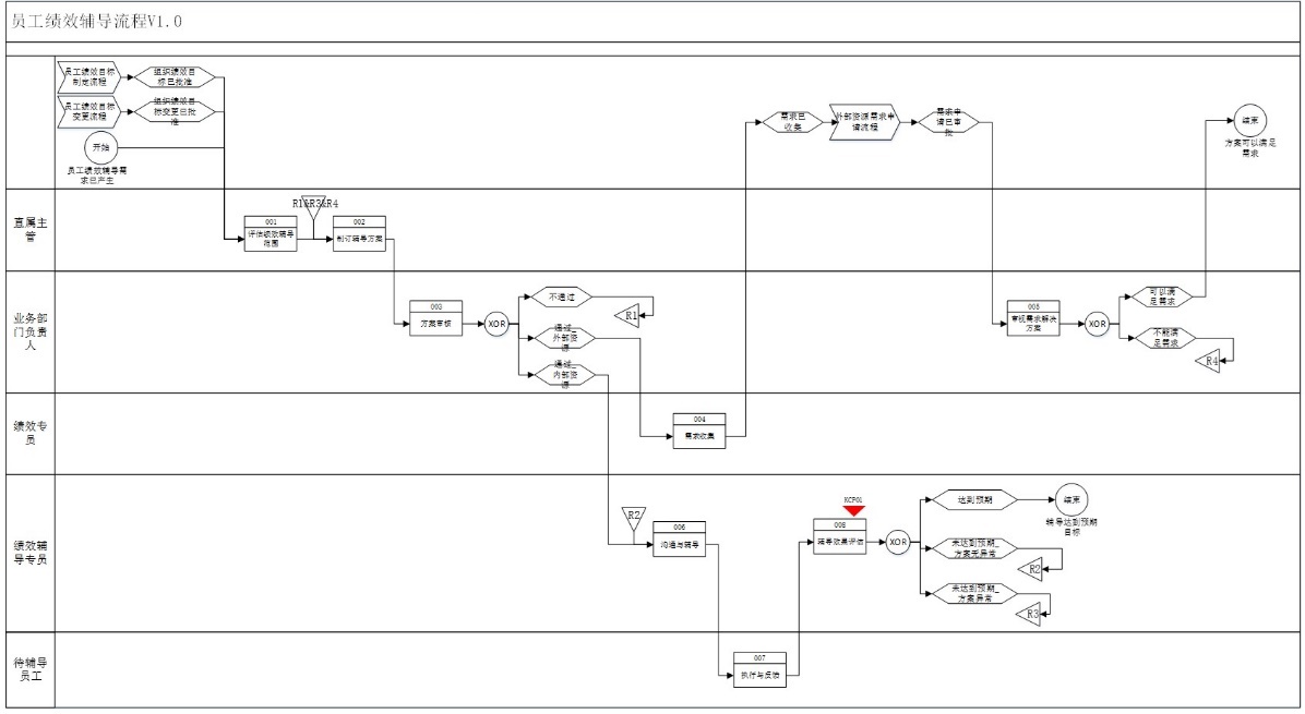 在每个泳道里都有具体的活动,这个活动包含了活动名称及活动编码。活动编码是活动在该流程中的位置序号,当然,实际执行的时候可能因为场景不同而有多种不同排列组合。在泳道中,活动后面连接的XOR符号,后面衔接了多个路径(Track)的,这是比较常见的业务场景的梳理,即依据不同的业务场景走不同的流程通道。