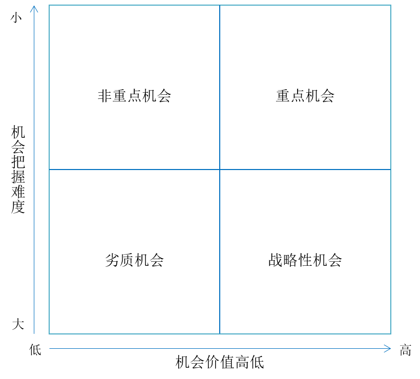 从机会带来的价值高低、机会把握难度大小两个维度区分出重点机会、非重点机会、战略性机会和劣质机会,可以帮助企业在机会面前权衡机会大小、资源约束和机会成本,帮助正确把握机会。