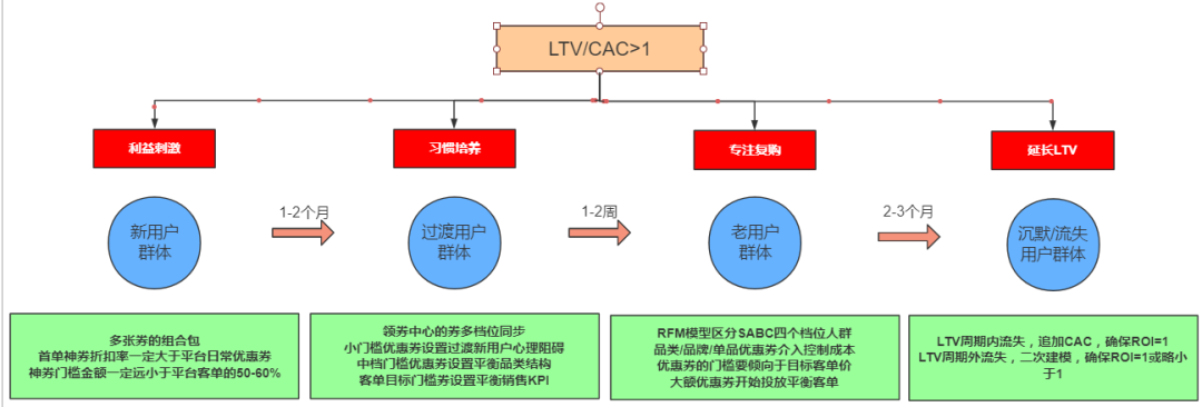 这一部分用户经历1~2个月的培养后,开始适应并逐渐习惯购物节奏。此时优惠券策略重点在于拉复购。