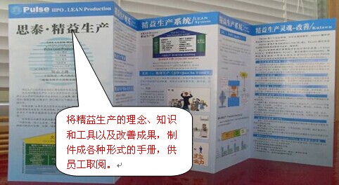 在全公司范围内广泛展开精益宣传活动,将精益生产的理念和方法、精益改善的成果,尤其是员工参与的培训、研讨、改善、成果与表彰等相关活动充分在全公司范围内宣传和展示,使员工充分体验精益改善的氛围和文化,更强地融入企业。