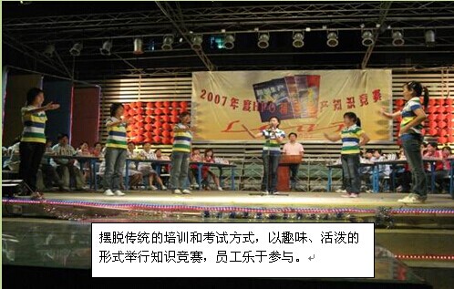 我们常常说要对全体员工进行精益的培训,但培训的方式不仅仅限于在培训室讲课,培训的形式可以是丰富多样的。把精益理念、工具、实践通过海报、宣传栏、晚会活动、标语口号、知识比赛、沙龙等不同形式进行宣传,其实就是对员工最简单、最快捷的一种培训。员工很容易接受这些多样性的、参与性的培训方式,其效果甚至远远好过单一的课堂式上课。